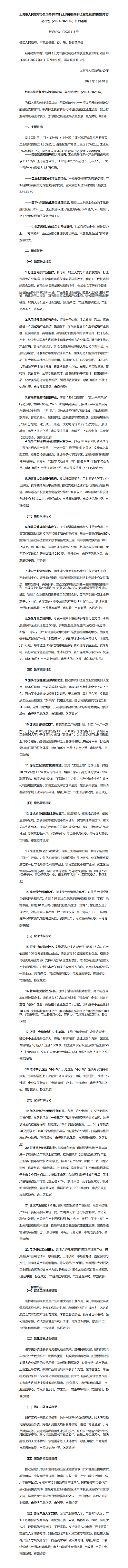 上海市推動制造業(yè)高質(zhì)量發(fā)展三年行動計劃(2023-2025年) 日期:2023/6/16 來源:康橋?qū)崢I(yè)